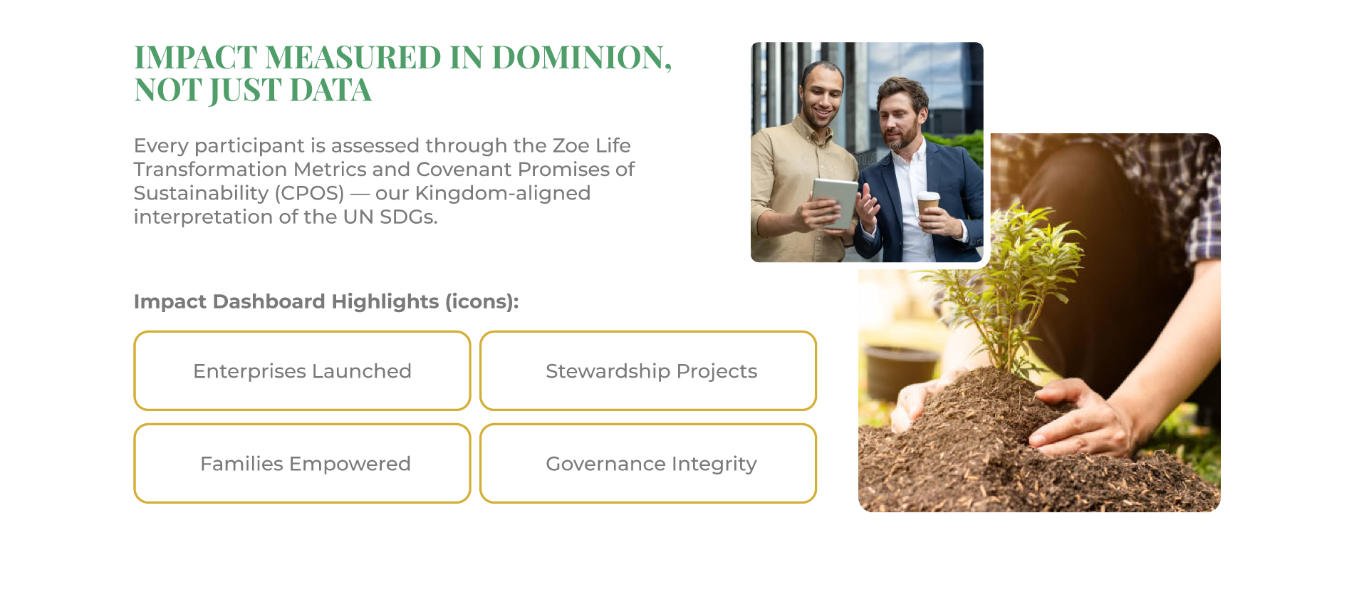 Our approach blends spiritual foundation business acceleration, spiritual formation, and sustainable-development strategy to cultivate ventures that honor God, serve communities, and steward the planet.